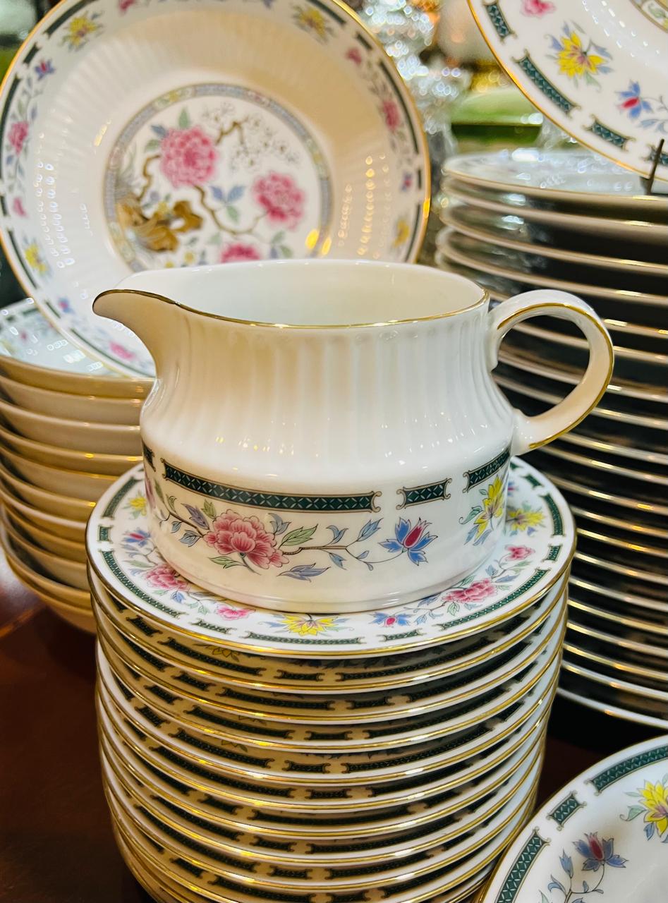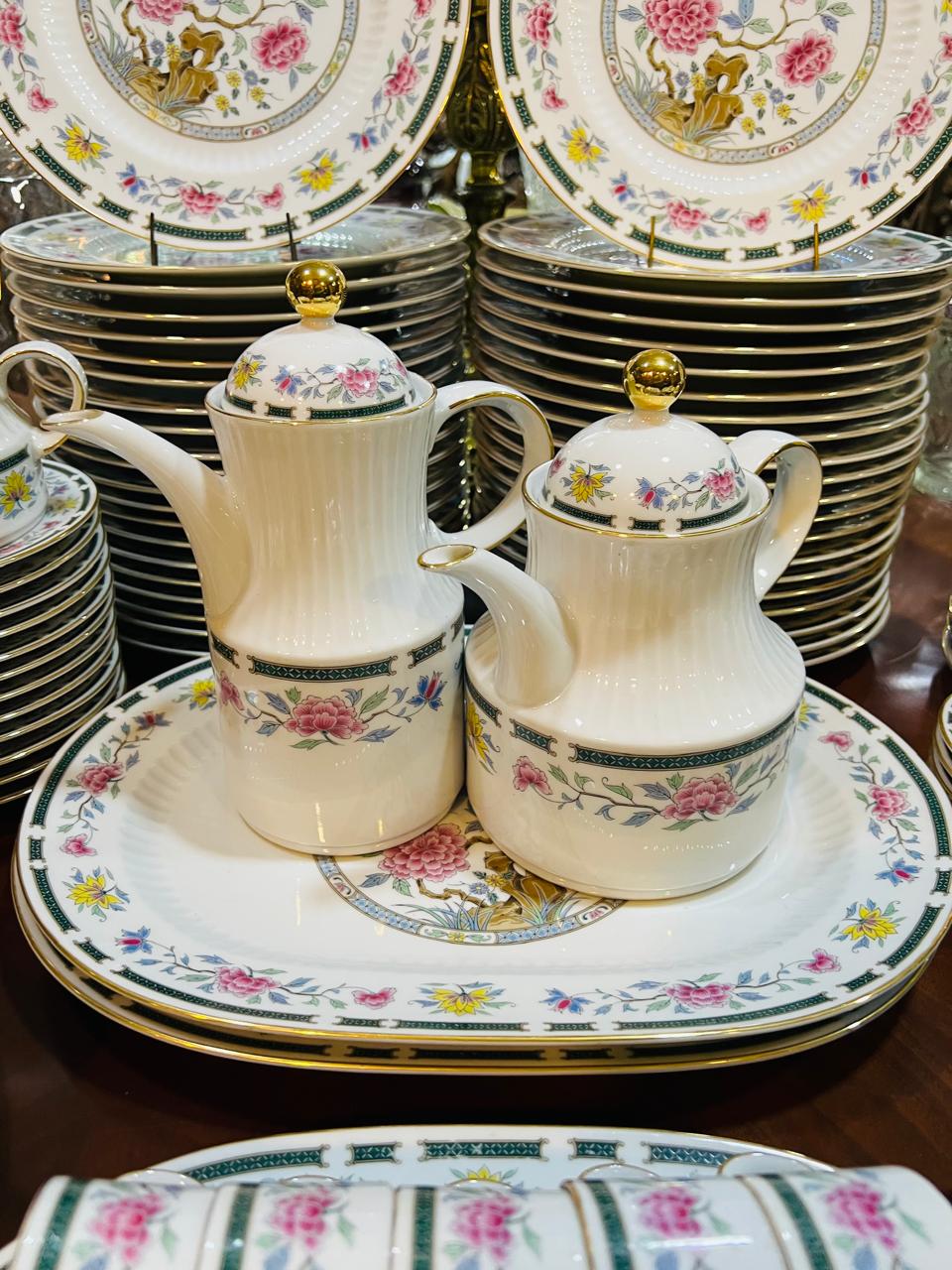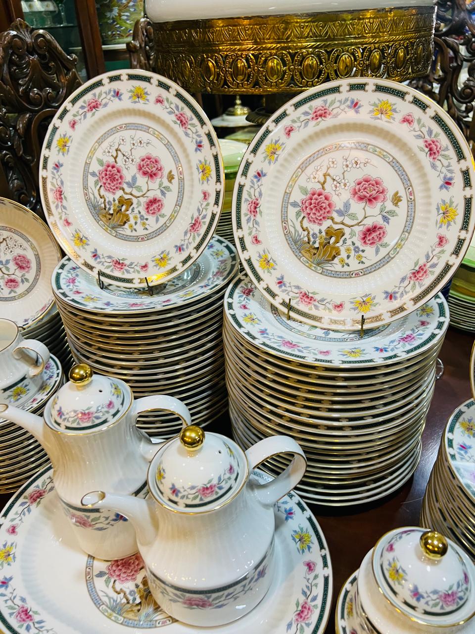 Antigua vajilla de la empresa Tsuji de porcelana base blanca, borde dorado, guarda verde con flores, interior acanalado; peonía y flores en su centro. Se compone de 42 platos playos, 12 platos hondos, 16 platos de postre, 11 tazas de café, 5 platos de café, 10 tazas de té, 12 platos de té, 3 fuentes ovaladas, 2 platos grandes para torta, 2 ensaladeras, 2 compoteras, salsera, tetera, cafetera, azucarera y lechera. Irrepetible por su cantidad de piezas.