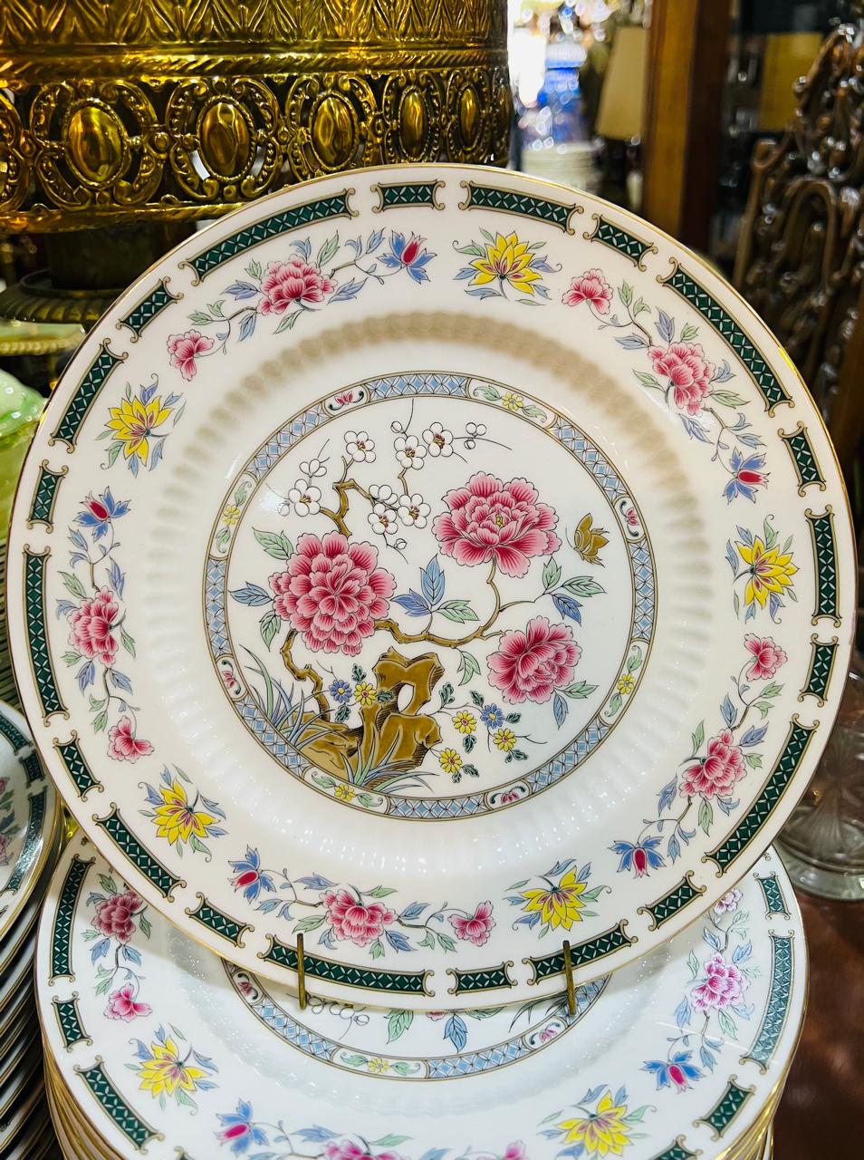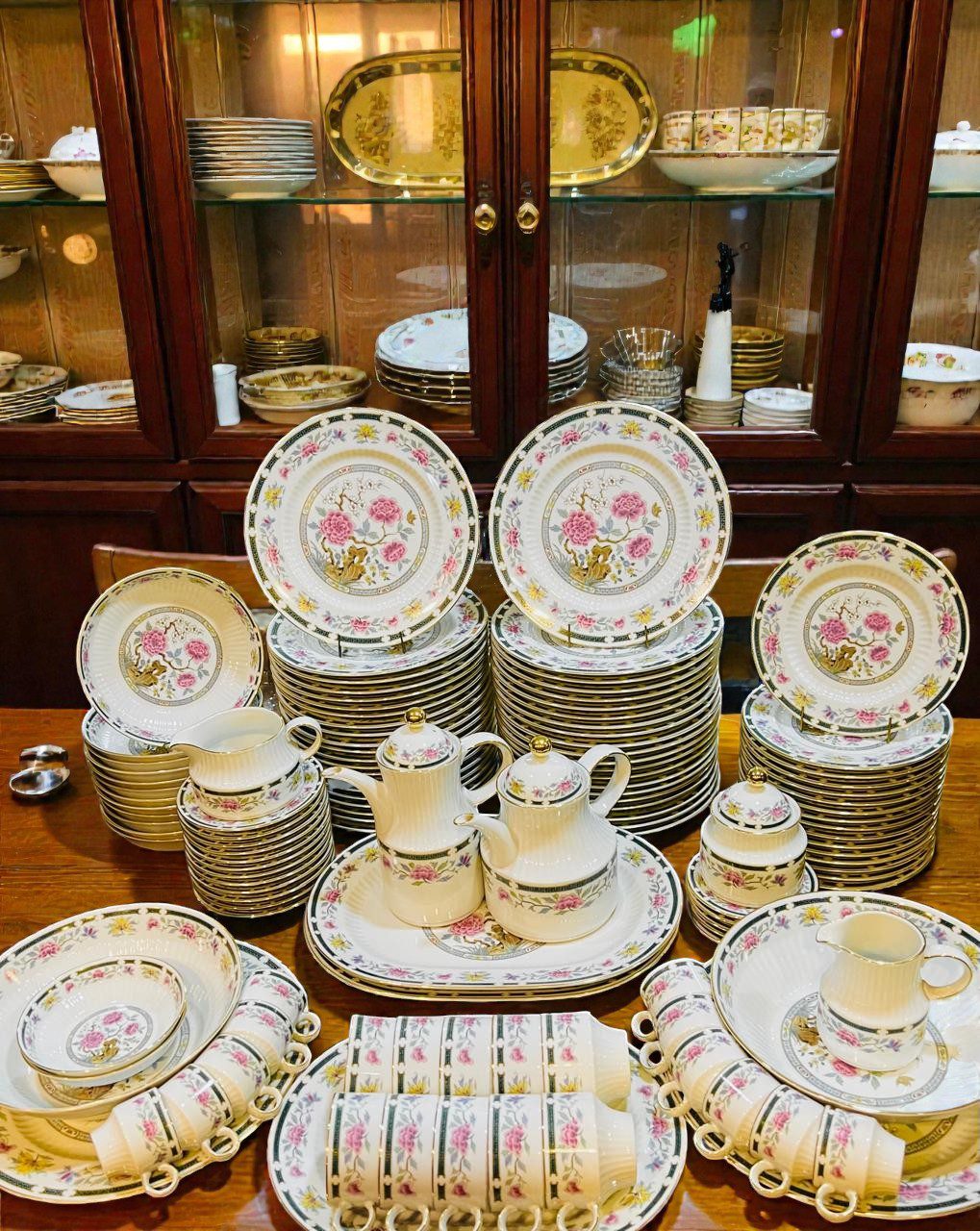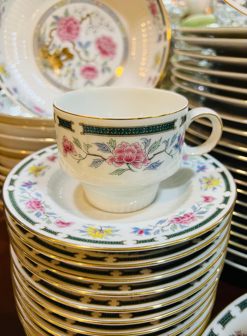 Antigua vajilla de la empresa Tsuji de porcelana base blanca, borde dorado, guarda verde con flores, interior acanalado; peonía y flores en su centro. Se compone de 42 platos playos, 12 platos hondos, 16 platos de postre, 11 tazas de café, 5 platos de café, 10 tazas de té, 12 platos de té, 3 fuentes ovaladas, 2 platos grandes para torta, 2 ensaladeras, 2 compoteras, salsera, tetera, cafetera, azucarera y lechera. Irrepetible por su cantidad de piezas.