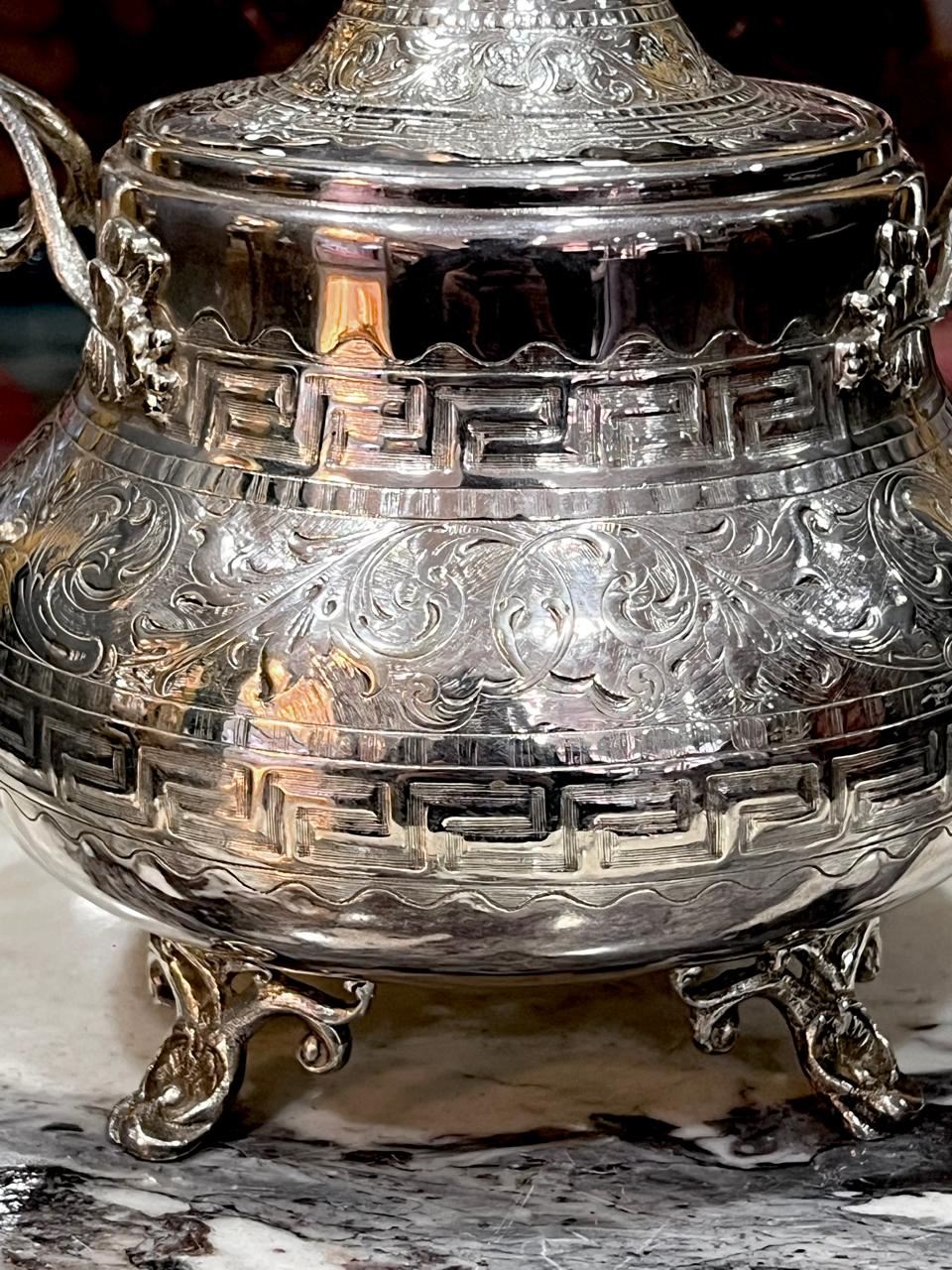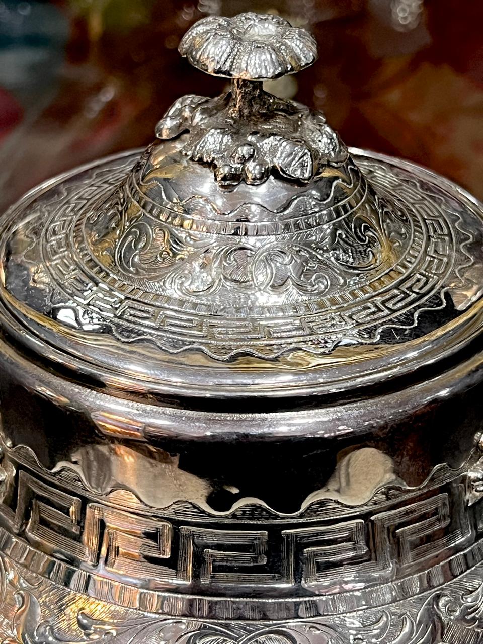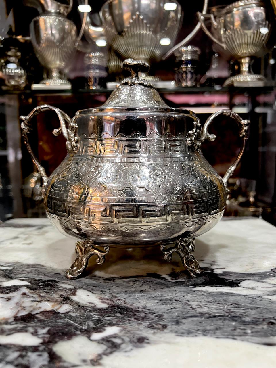 Azucarera de gran tamaño, aprox. 18 cm de altura y gran capacidad, con todo el contorno y la tapa labrados, 2 asas y patitas que le dan altura.