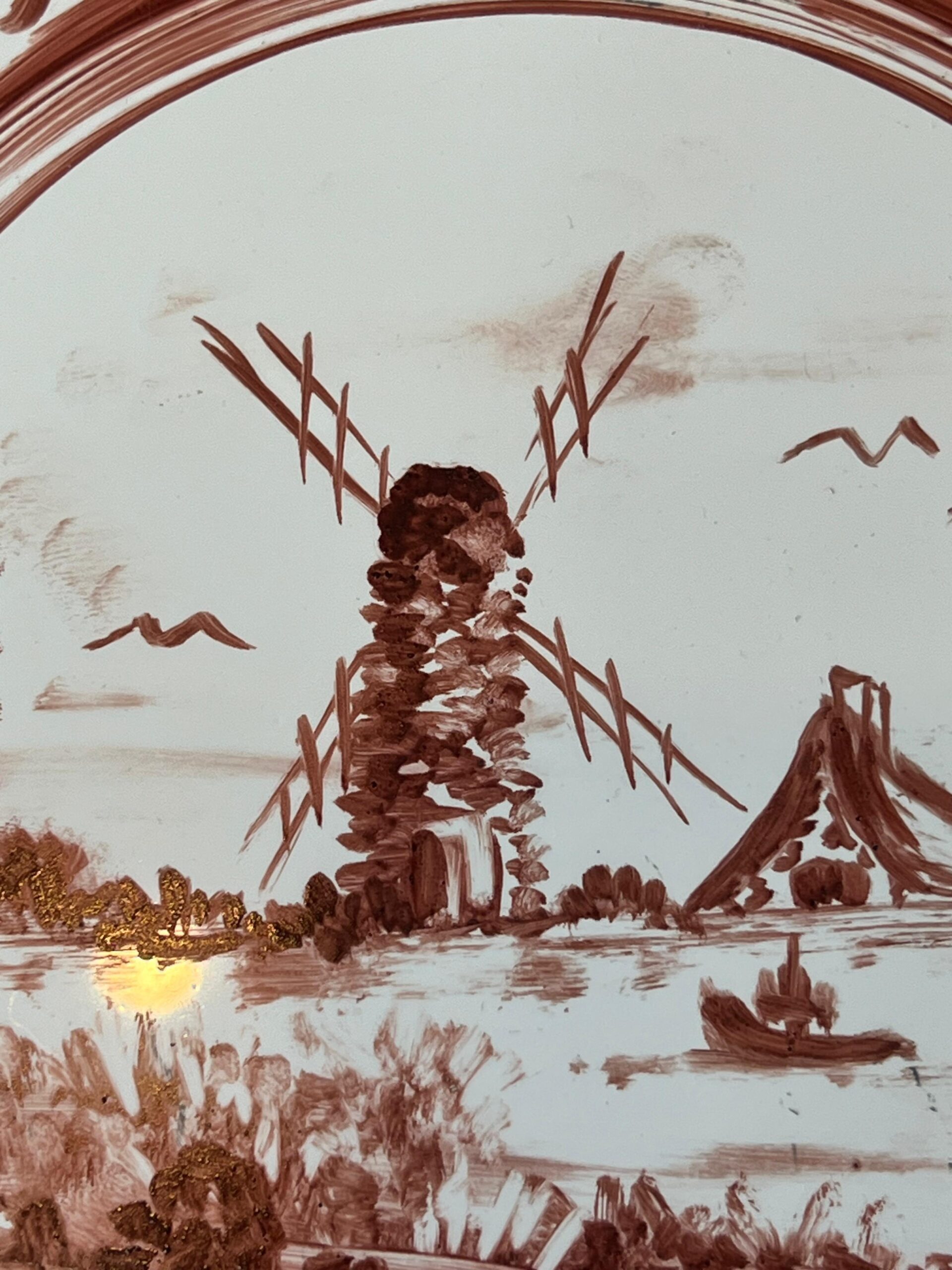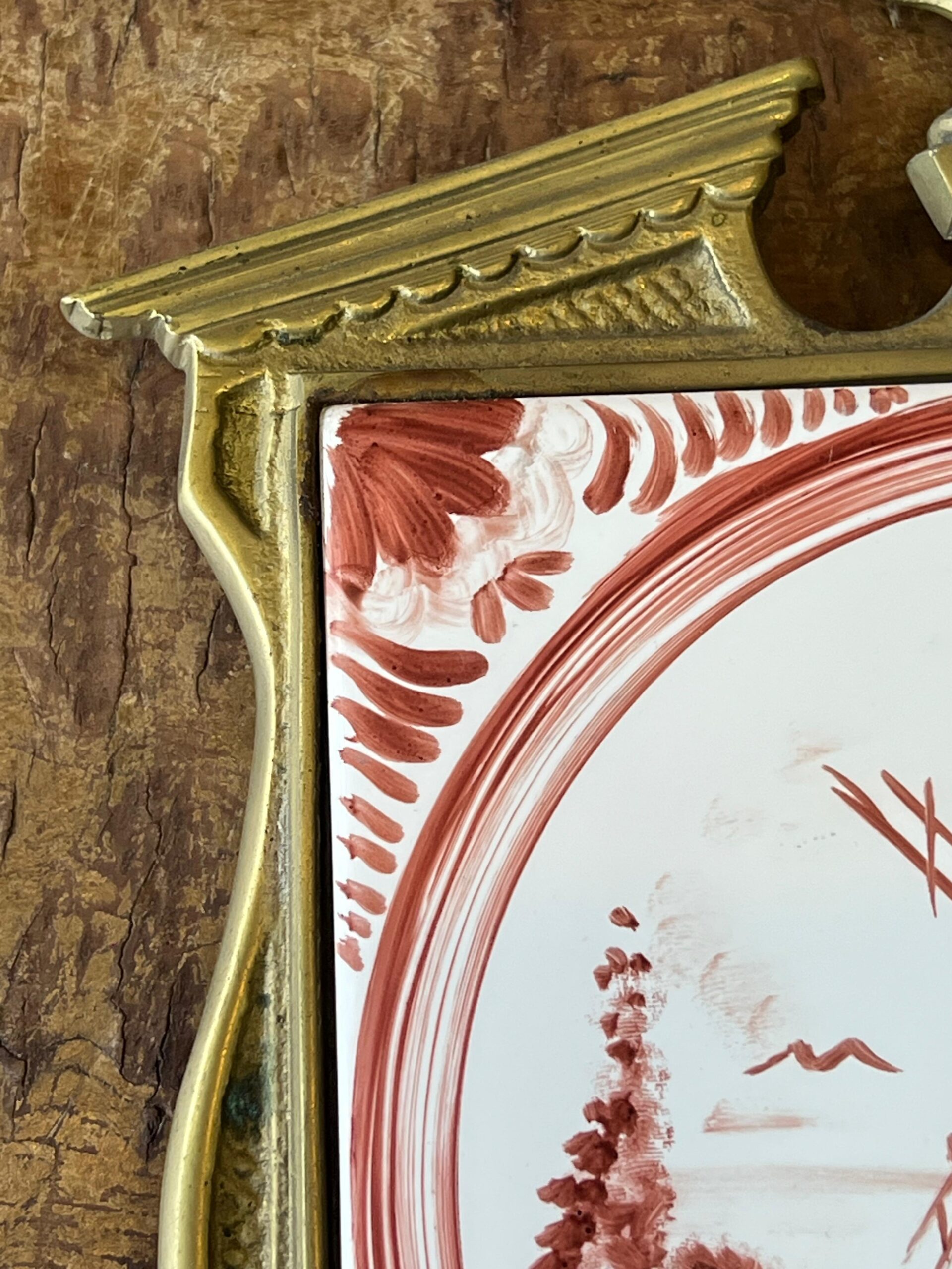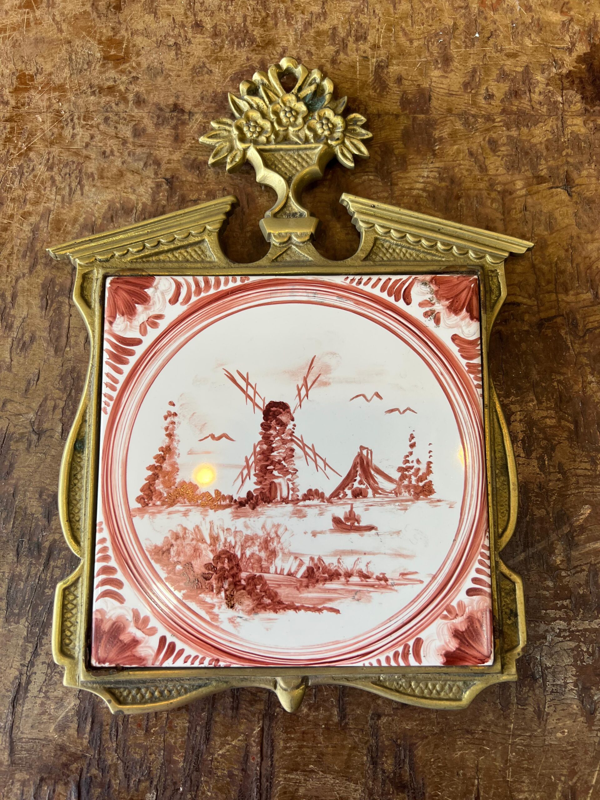 Antiguo adorno hecho en base a un azulejo pintado a mano con escena rural de molino, enmarcado en bronce con hermosa maceta y flores en la parte superior.