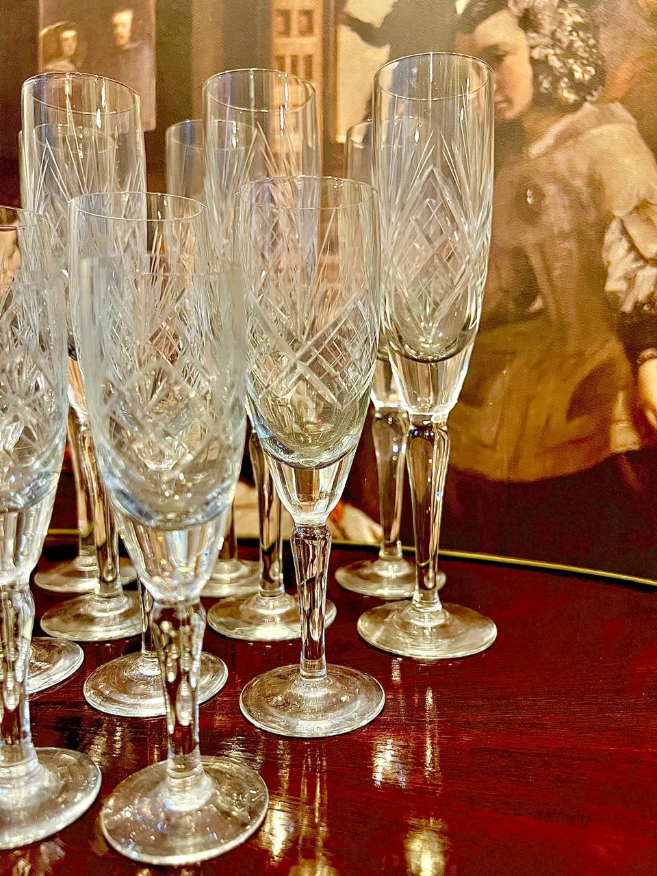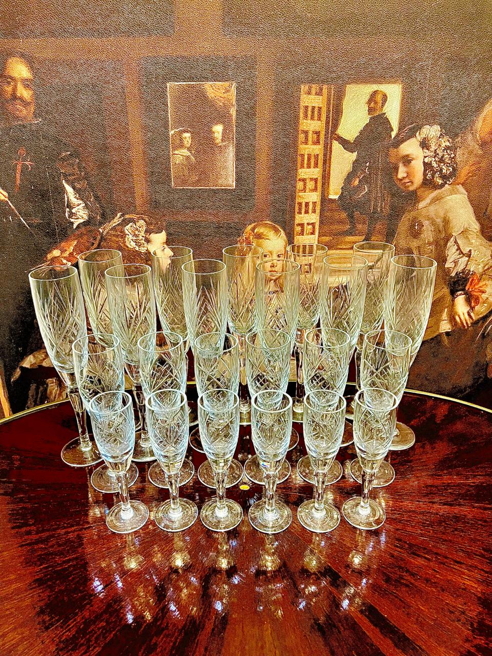 Antiguas copas de cristal tipo flauta con gran trabajo de talla a mano. 23 piezas totales: 11 copas de 21cm de altura, 6 copas de 15cm y 6 de 12cm.