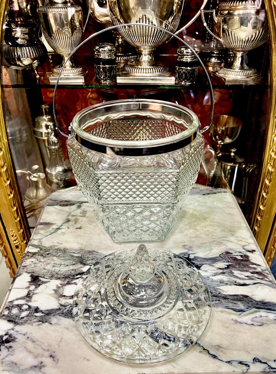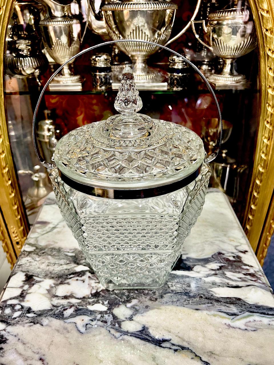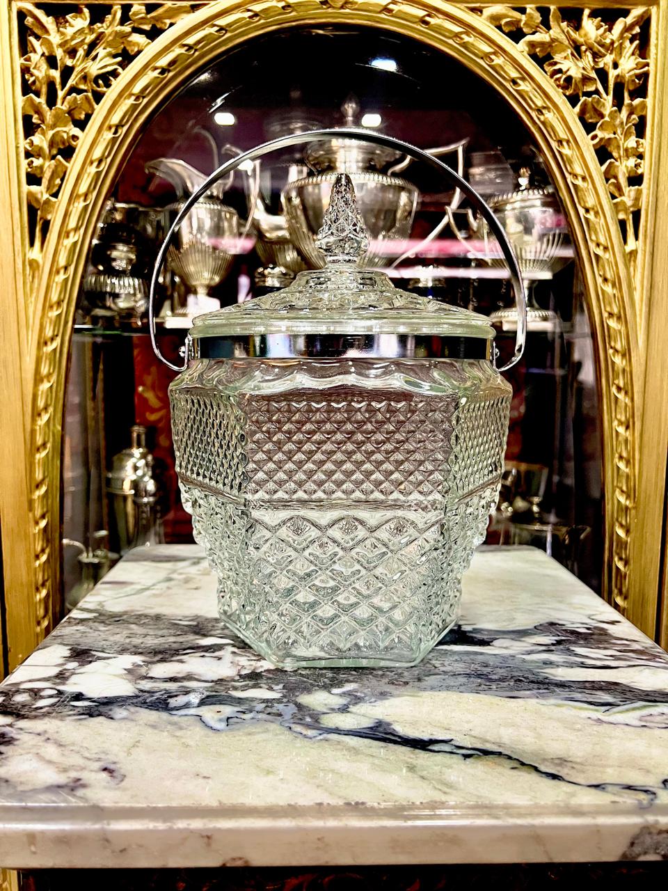 Jarro de vidrio prensado de diseño en relieve con asa metálica y tapa. Tiene 27 cm de altura y 17 cm de diámetro de boca. Impecable estado.