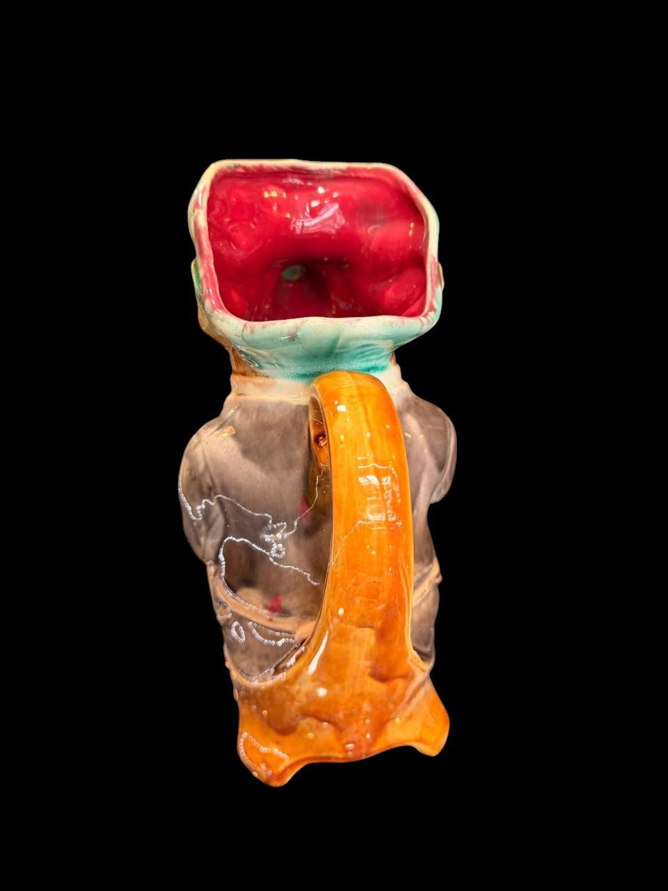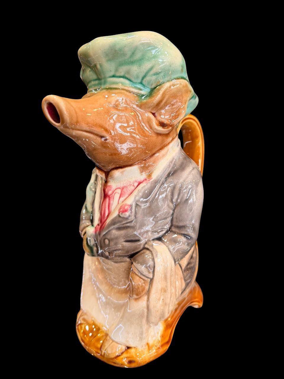 Jarra en cerámica con terminación mayólica francesa realizada entre 1890 y 1920 que representa a un cerdo vestido de camarero con un traje gris, delantal blanco, corbata roja y gorra turquesa, sentado en una silla que forma el asa. Artículo de coleccionismo.