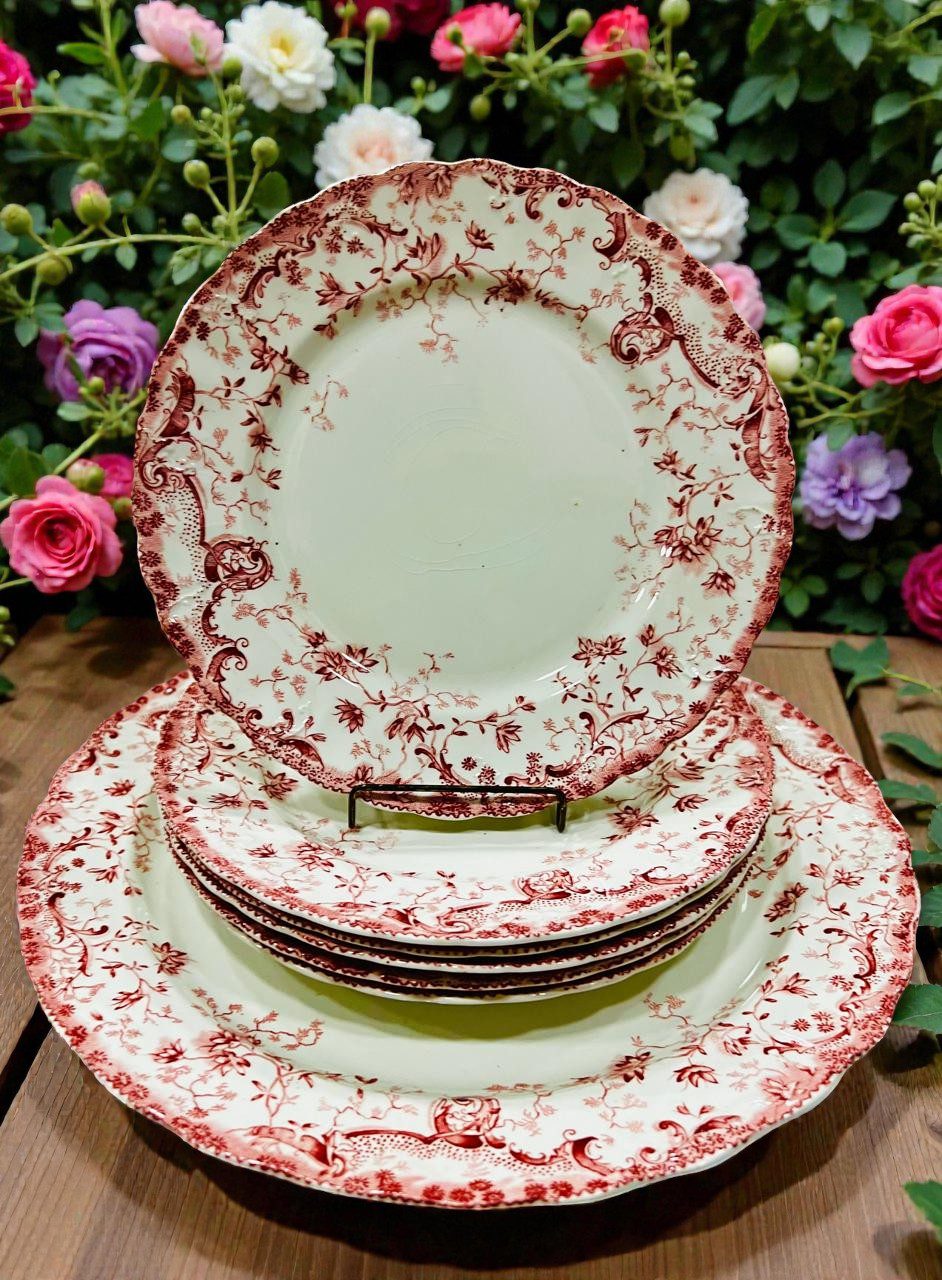 Antiquisimo juego compuesto por plato para masas de 28 cm de diámetro y 6 platos para postre de 20 cm de diámetro, patrón Vienna de base blanca con flores y arabescos en tonos rojos; han sido manufacturados entre 1865-1910 y se encuentran en excelente estado con su esmaltado intacto.
