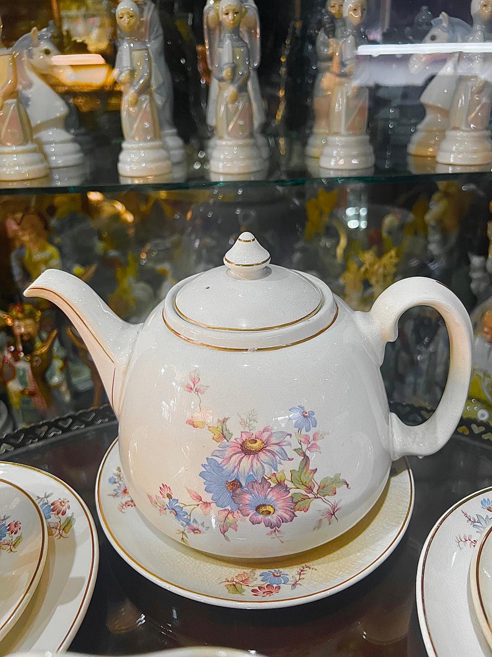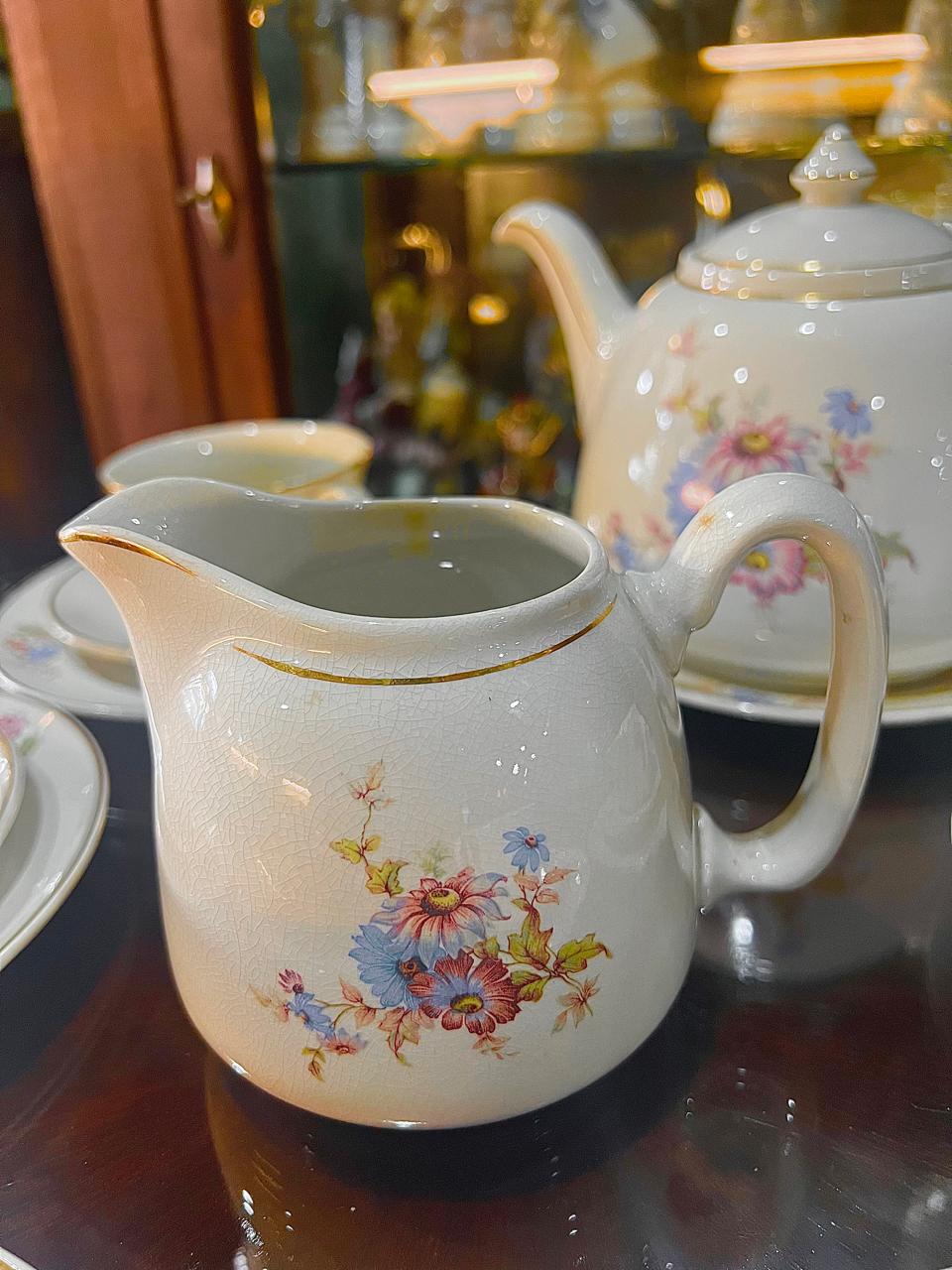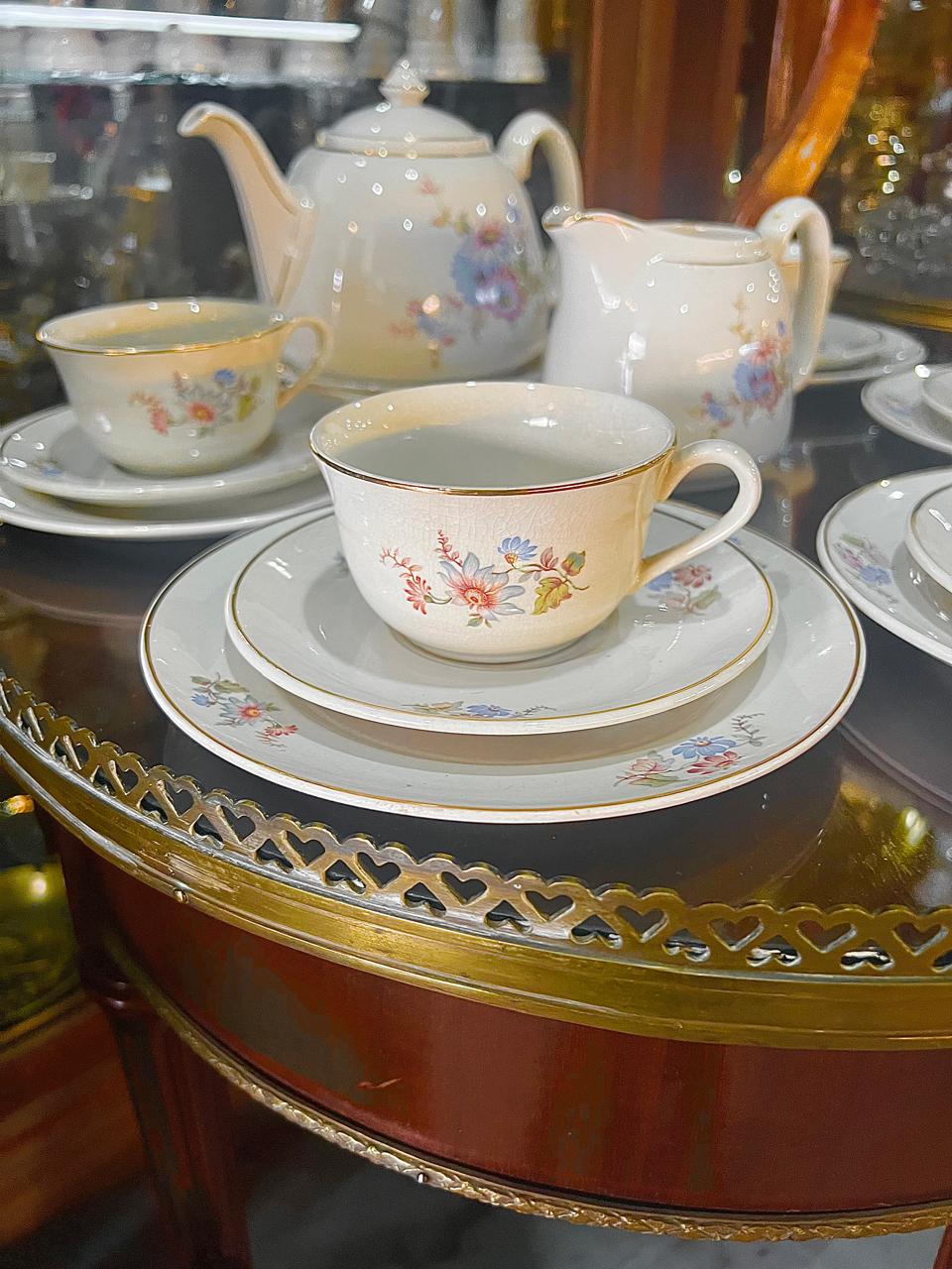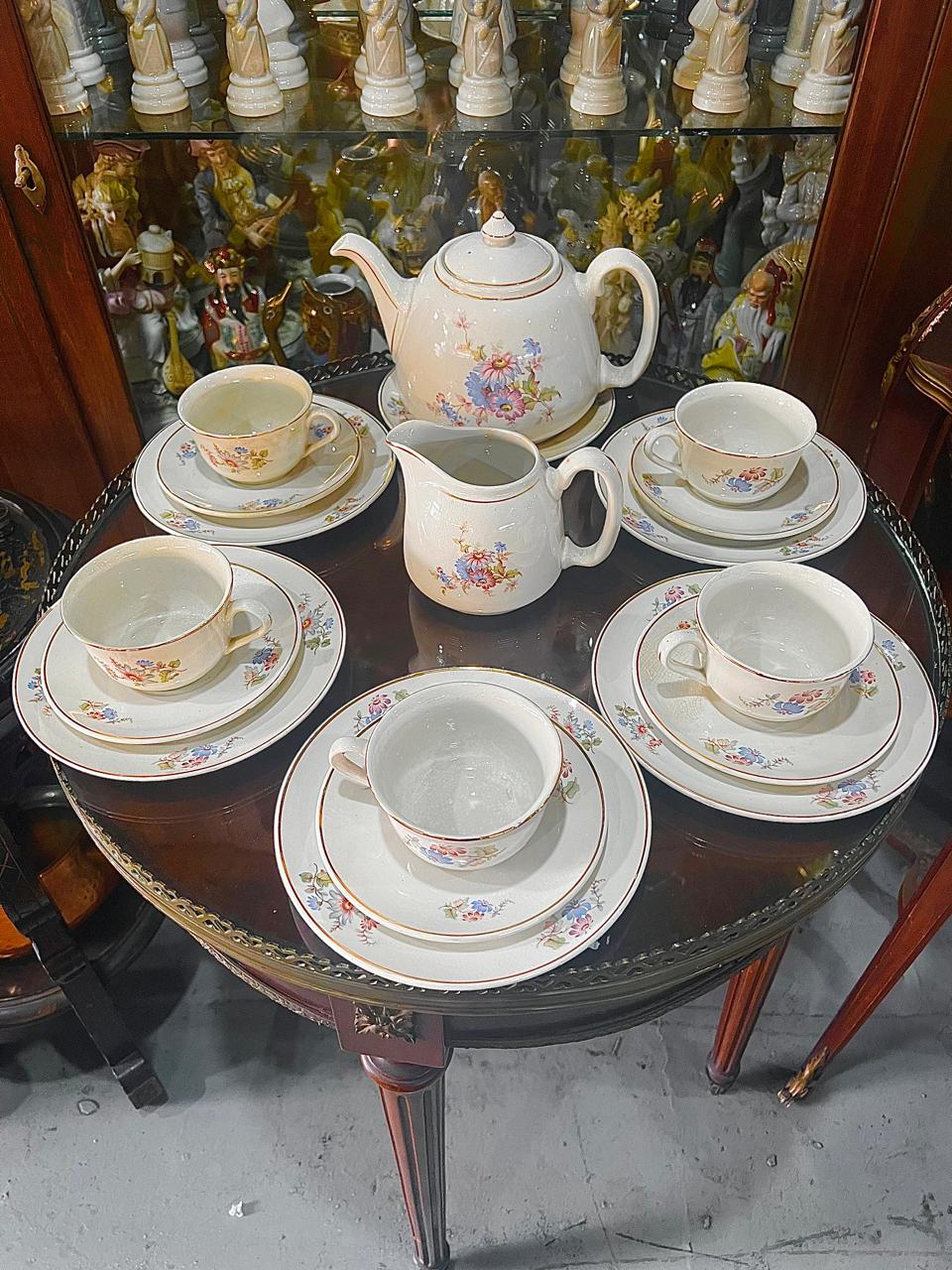 Antiguo juego de te de 20 piezas en loza blanca, con detalles de flores y virola dorada con algunos detalles de craquel acordes a su época. El juego consta de tetera, lechera, 6 tazas, 6 platos de té y 6 platos de torta.