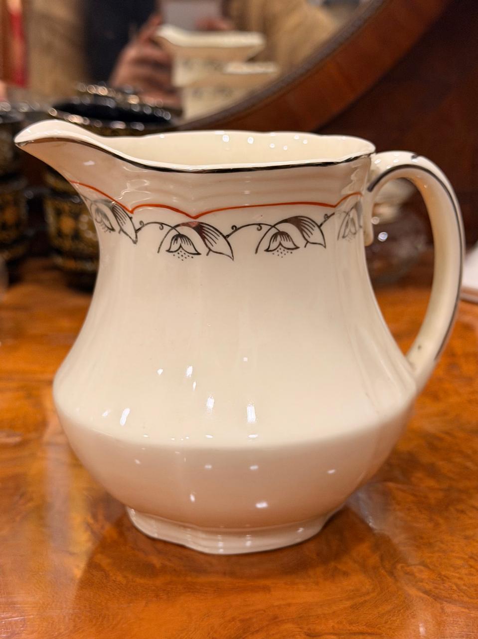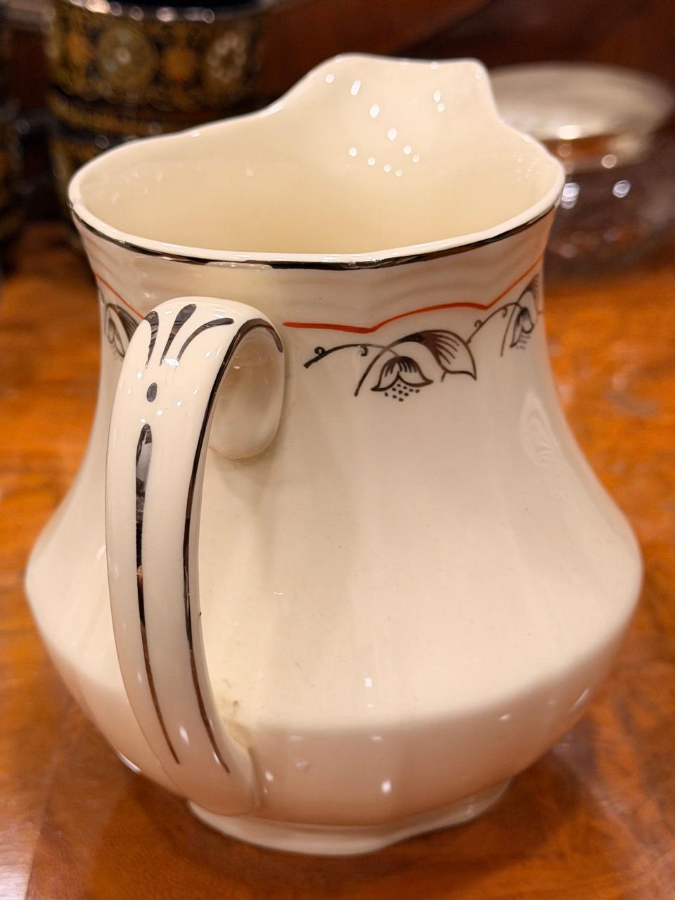 Lechera de loza inglesa en base color marfil con guarda naranja y dibujos en plata. Se encuentra en perfecto estado de conservación, sin detalles, ni chips, ni rajaduras.