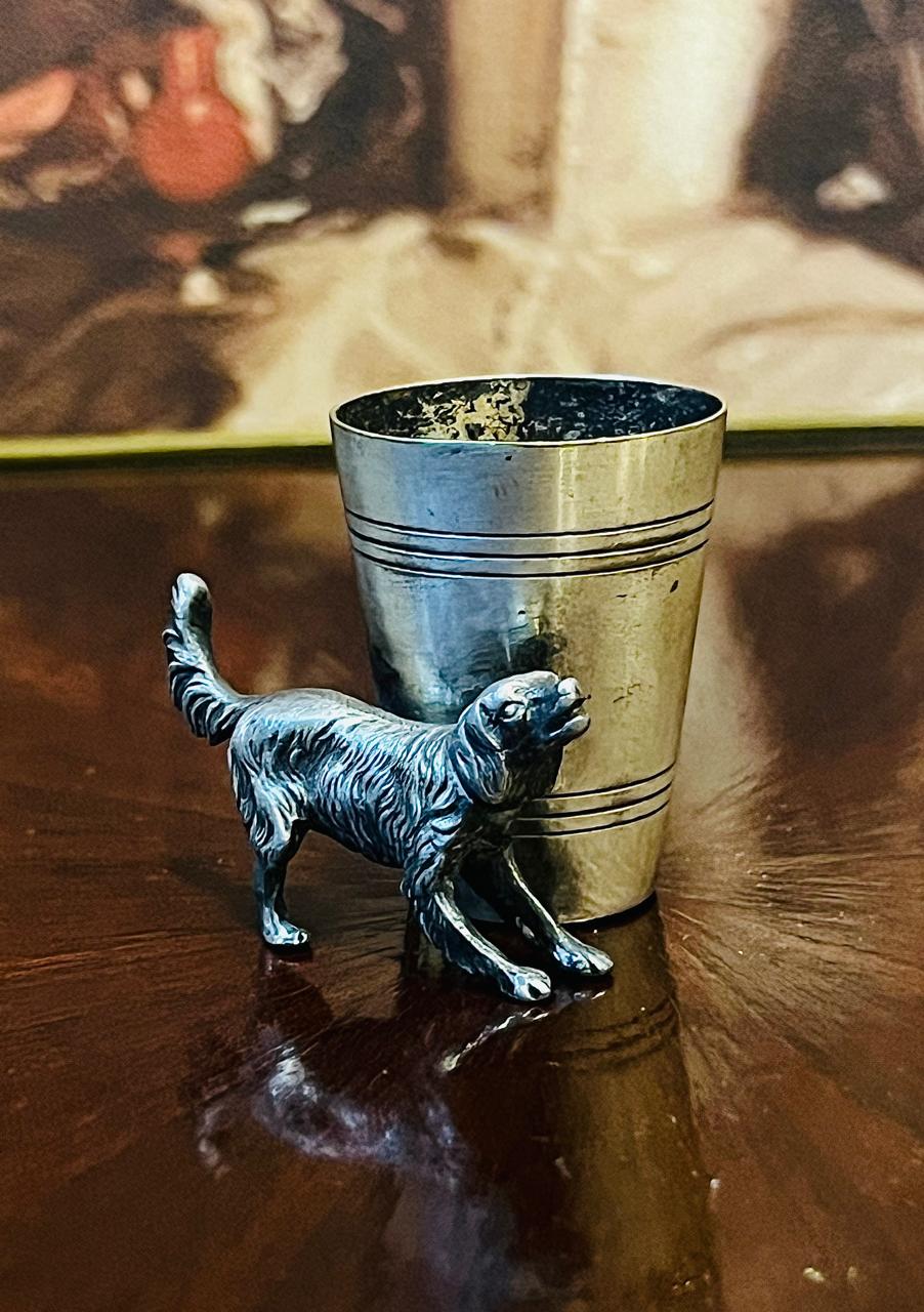 Antiguo palillero en metal blanco con baño de plata con figura canina en su base. Pieza de colección muy antigua y singular.
