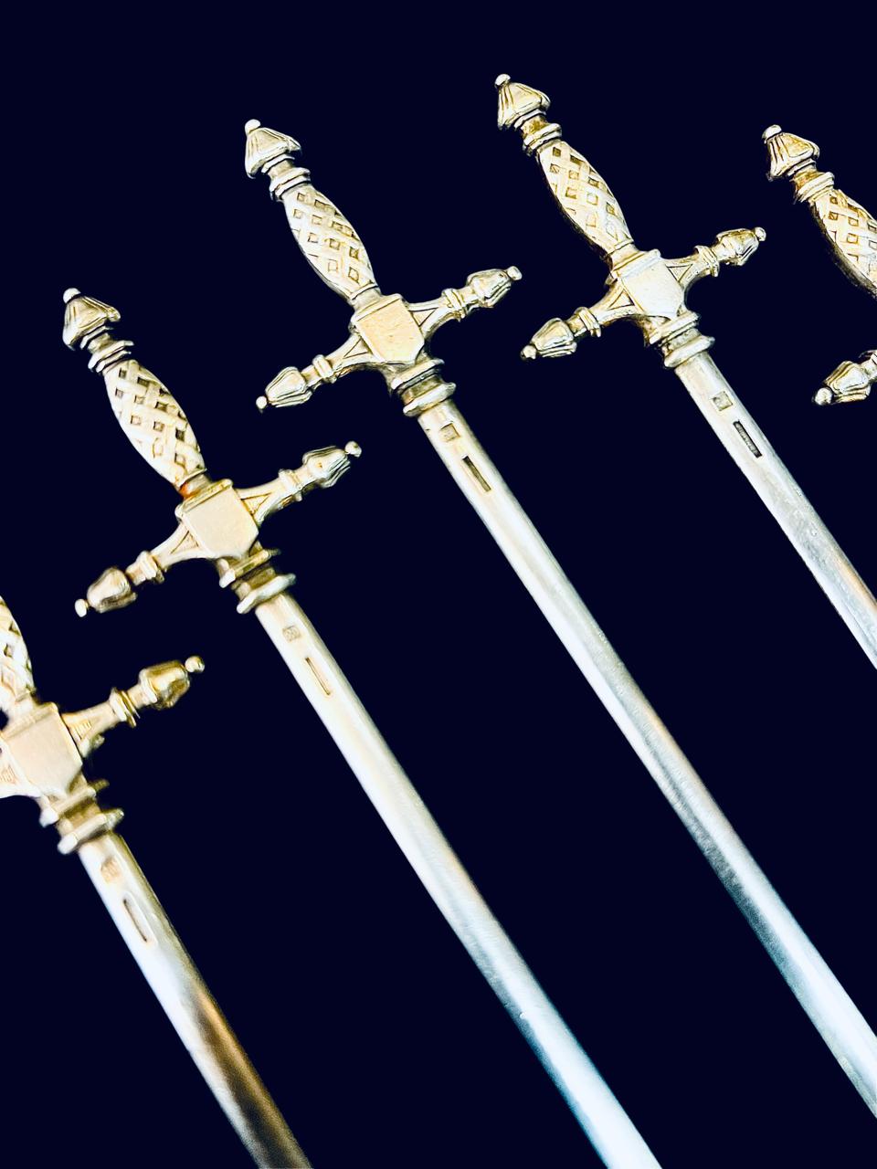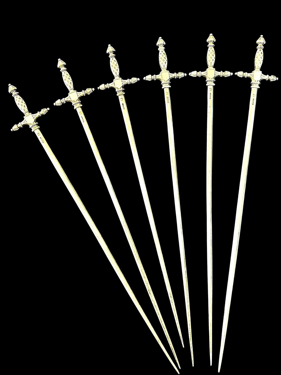 Antiquísimos pinchos para brochette de origen francés de la empresa Christofle de principios del siglo XX, 6 piezas singulares de colección. Aprox. 26 cm de largo.