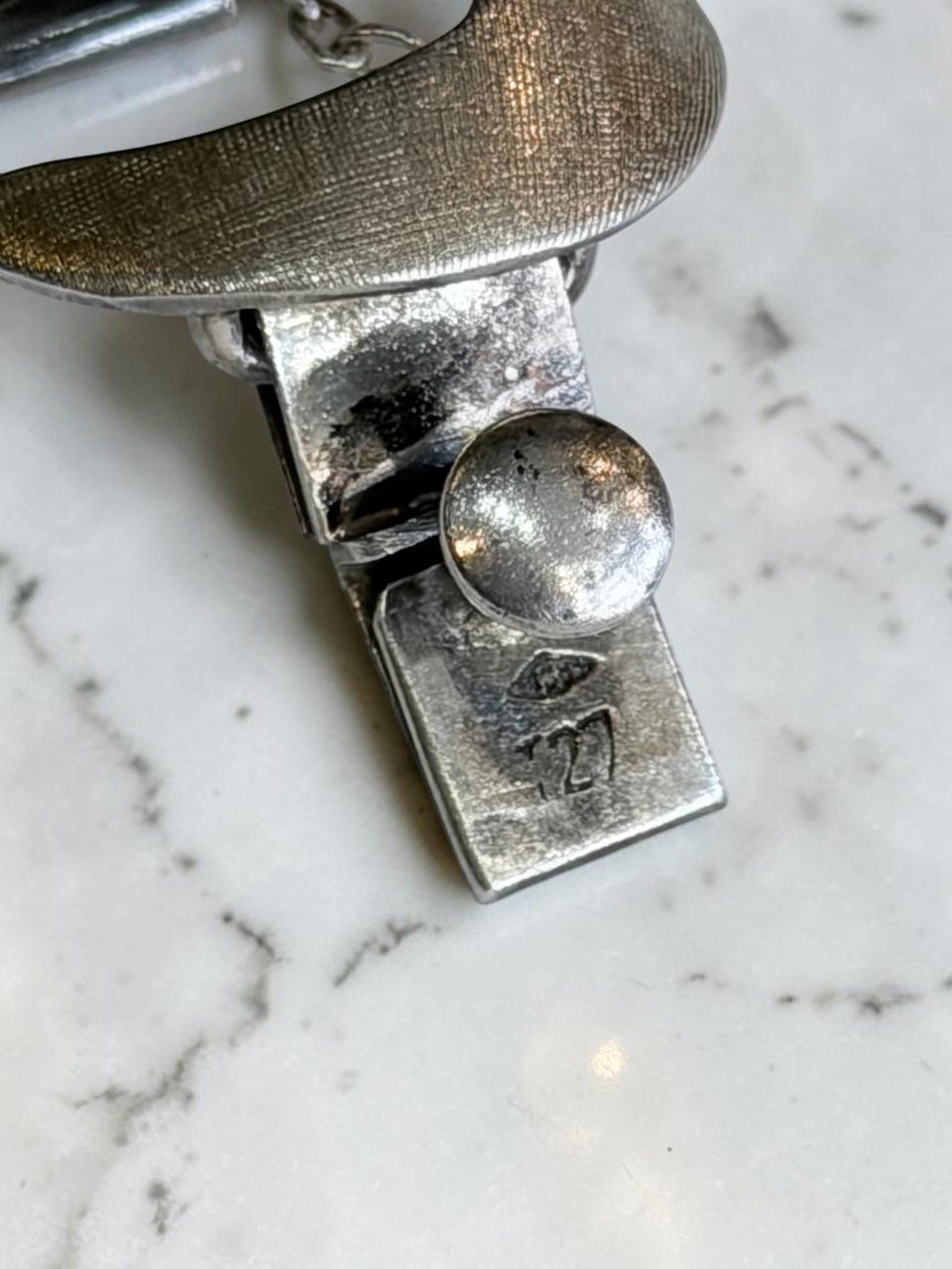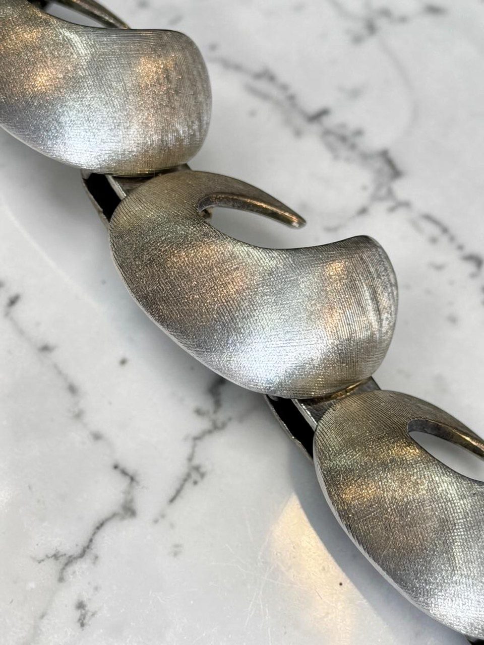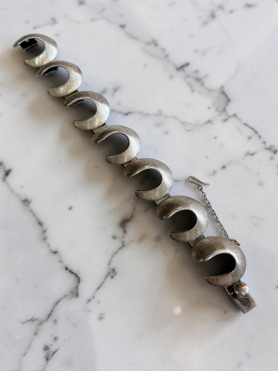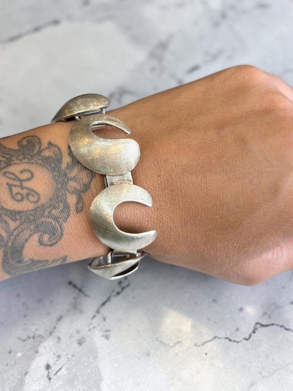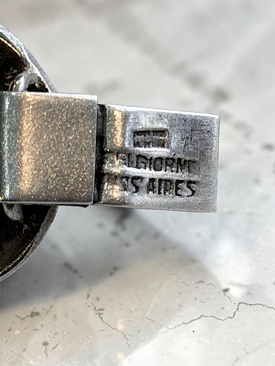 Excelente pulsera en plata diseñada por el afamado orfebre nacional Alberto Belgiorno, diseño vanguardista de figuras circulares con superficie cuadriculada de 20 cm de largo ,2 cm de ancho, con un peso de 62, cierre cajón y traba de seguridad.