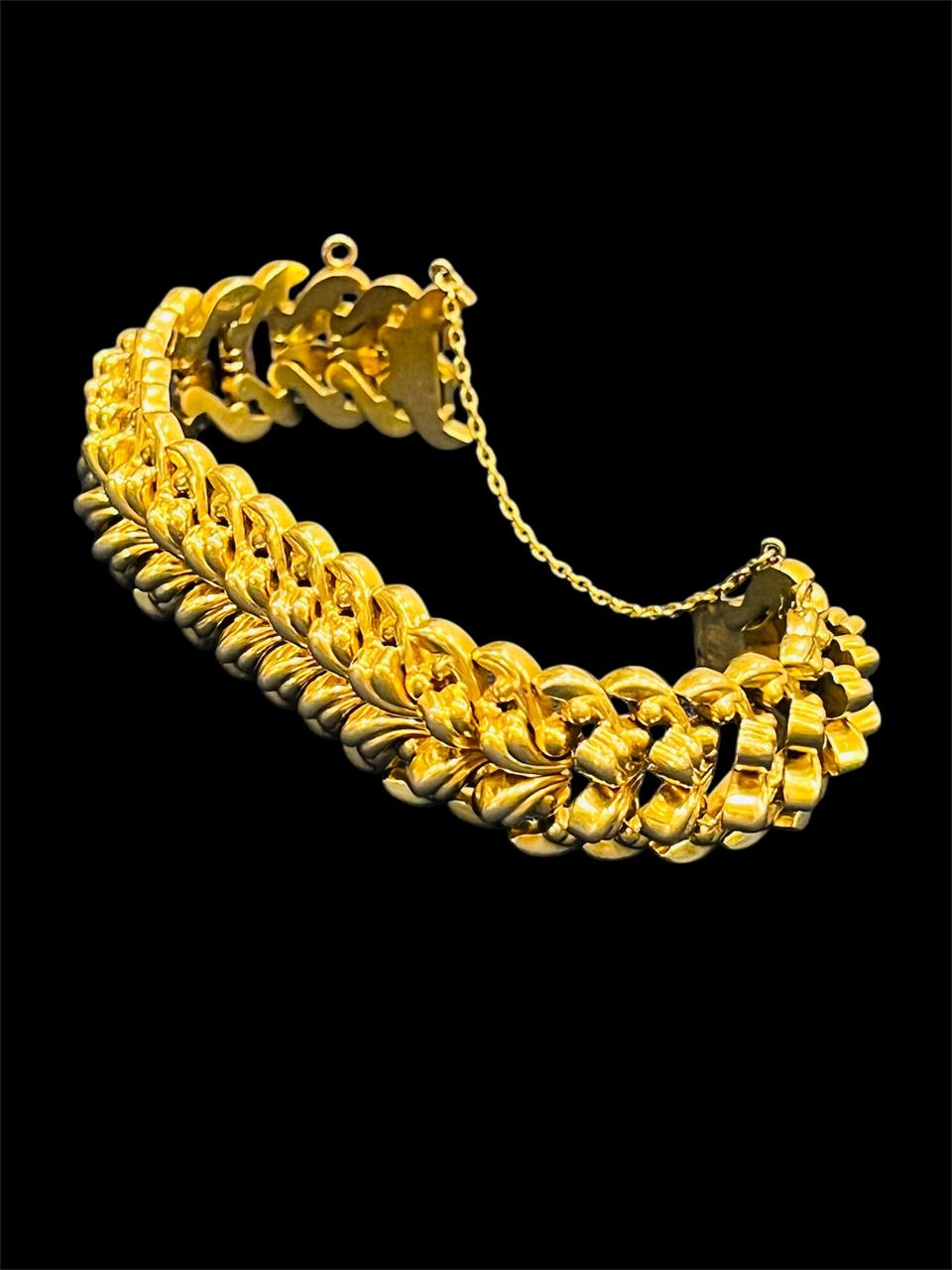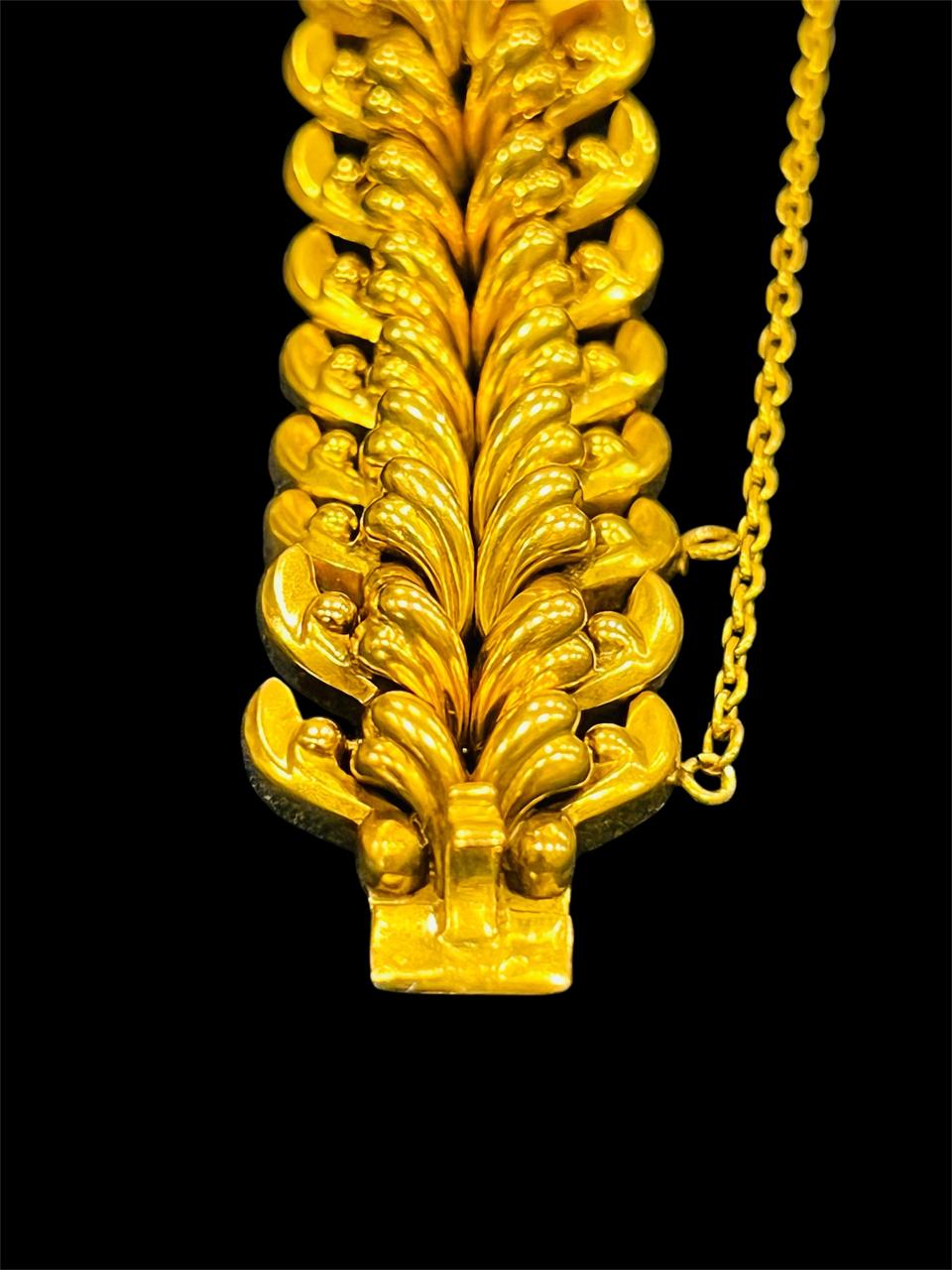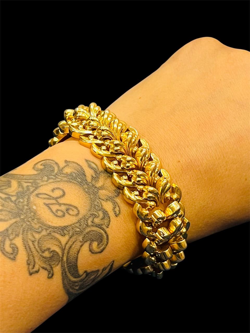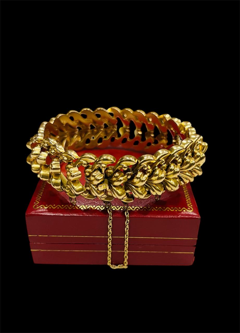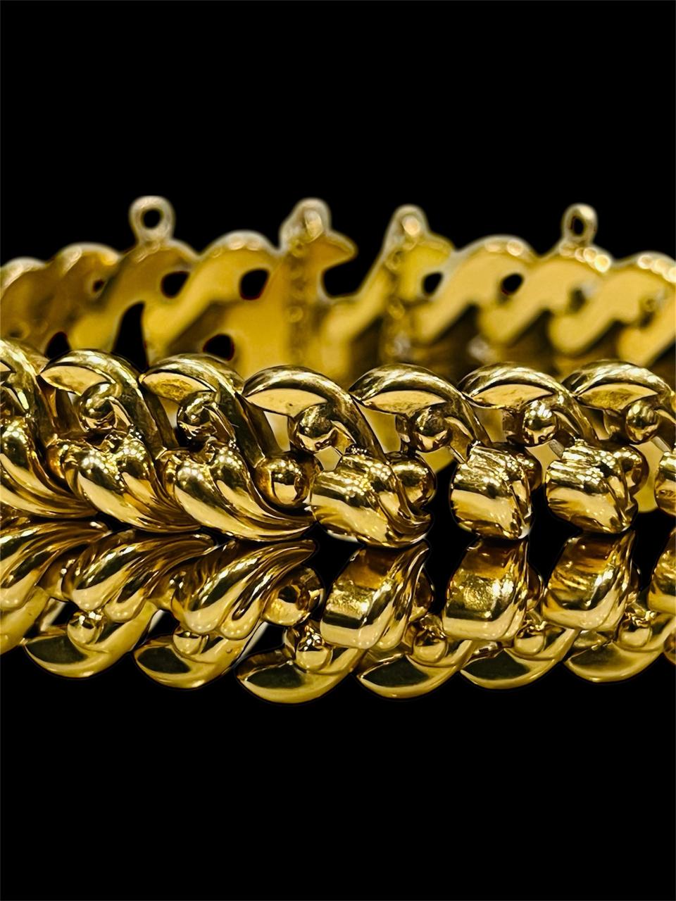 Sublime pulsera de dama en oro 18k con diseño de espigas corpóreas articuladas, de 18,5 cm de largo, 2 cm de ancho y 9 mm de altura., con cierre cajón y cadena de seguridad.