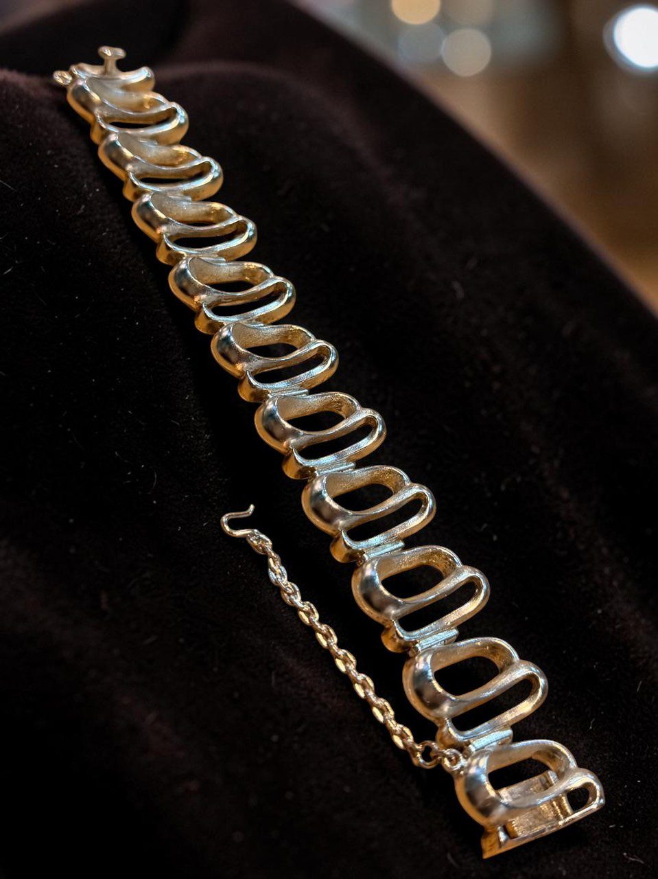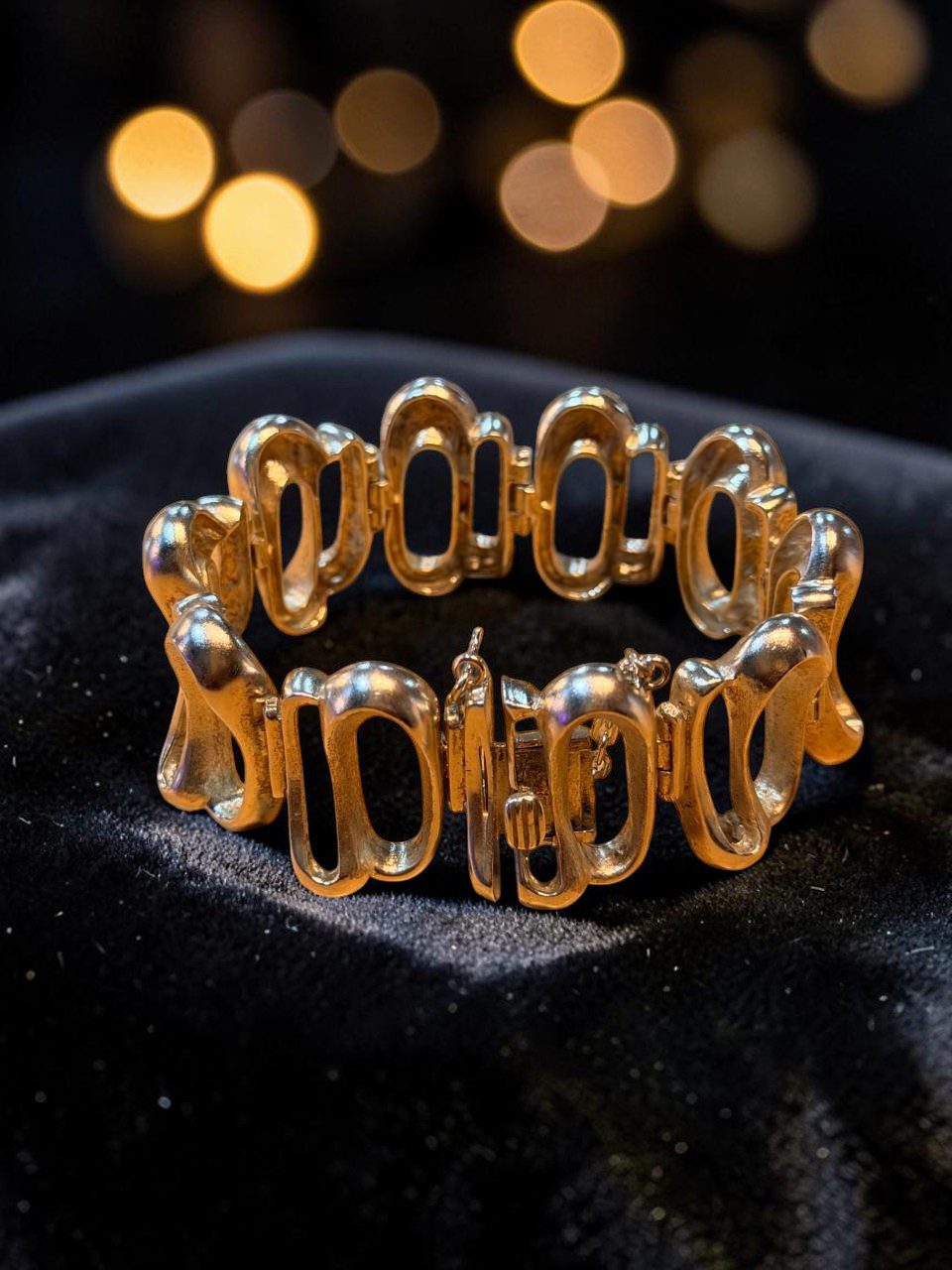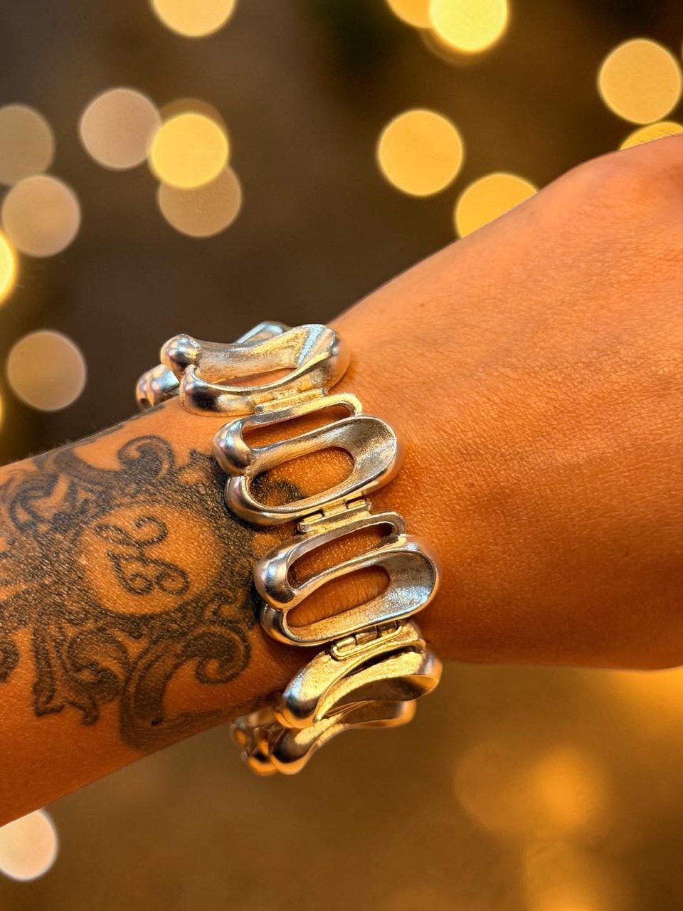 Excepcional pulsera de cuerpo robusto y buen tamaño con diseño de eslabones entrecruzados de un largo total de 20 cm, un ancho de 2.5 y un peso total de 75 gramos. Remata con cierre cajón y traba de seguridad.