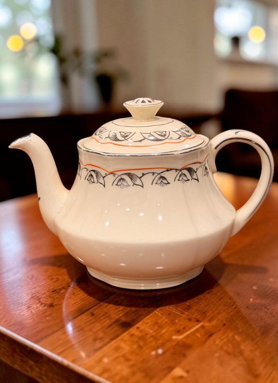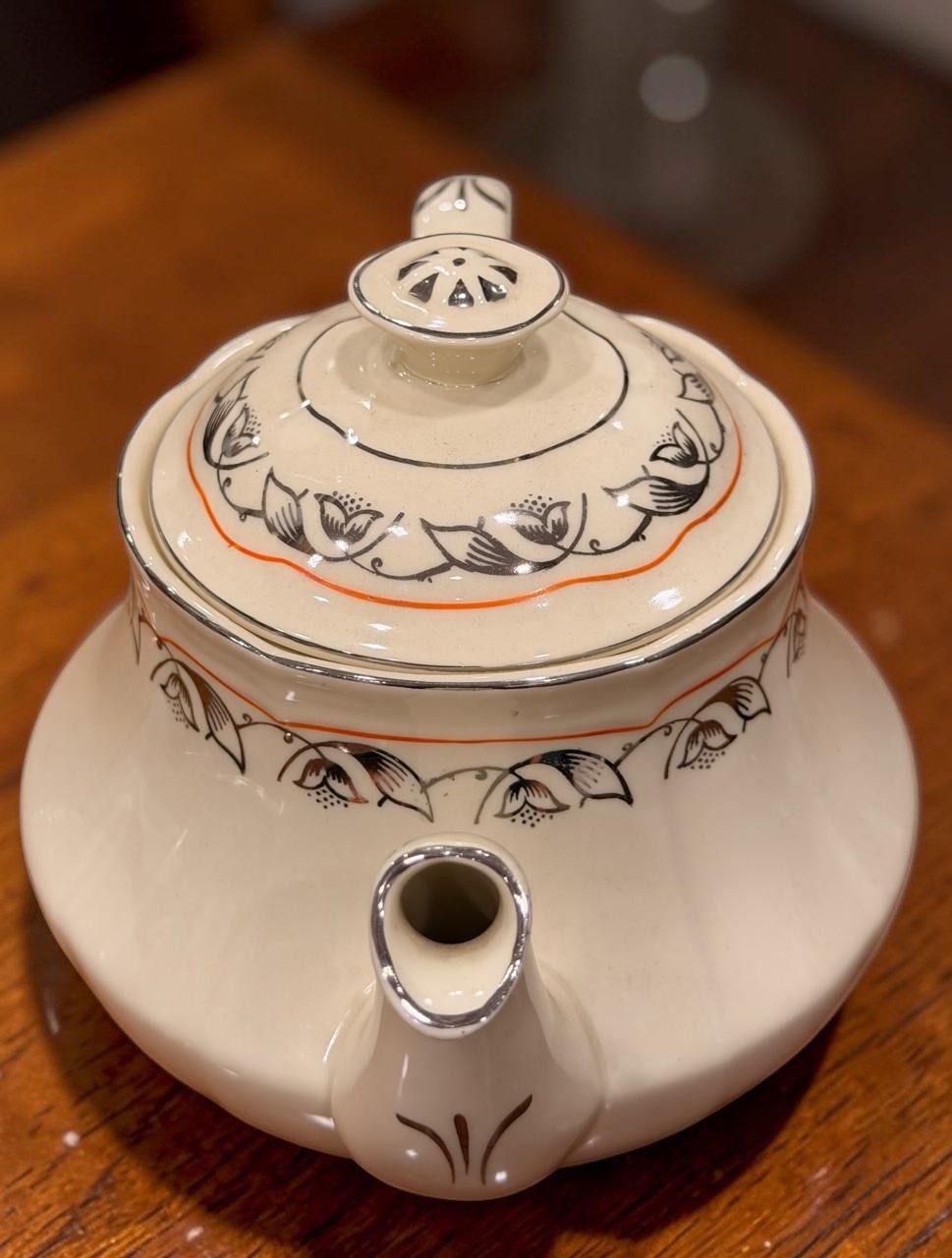 Tetera de loza inglesa en base color marfil con guarda naranja y dibujos en plata. Se encuentra en perfecto estado de conservación, sin detalles, ni chips, ni rajaduras.