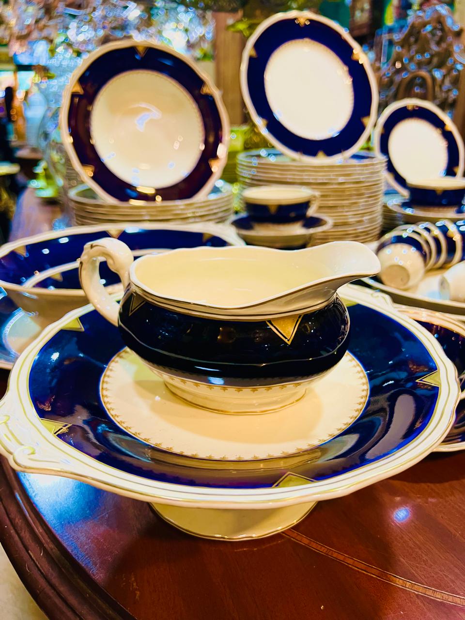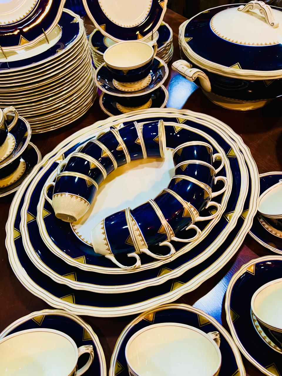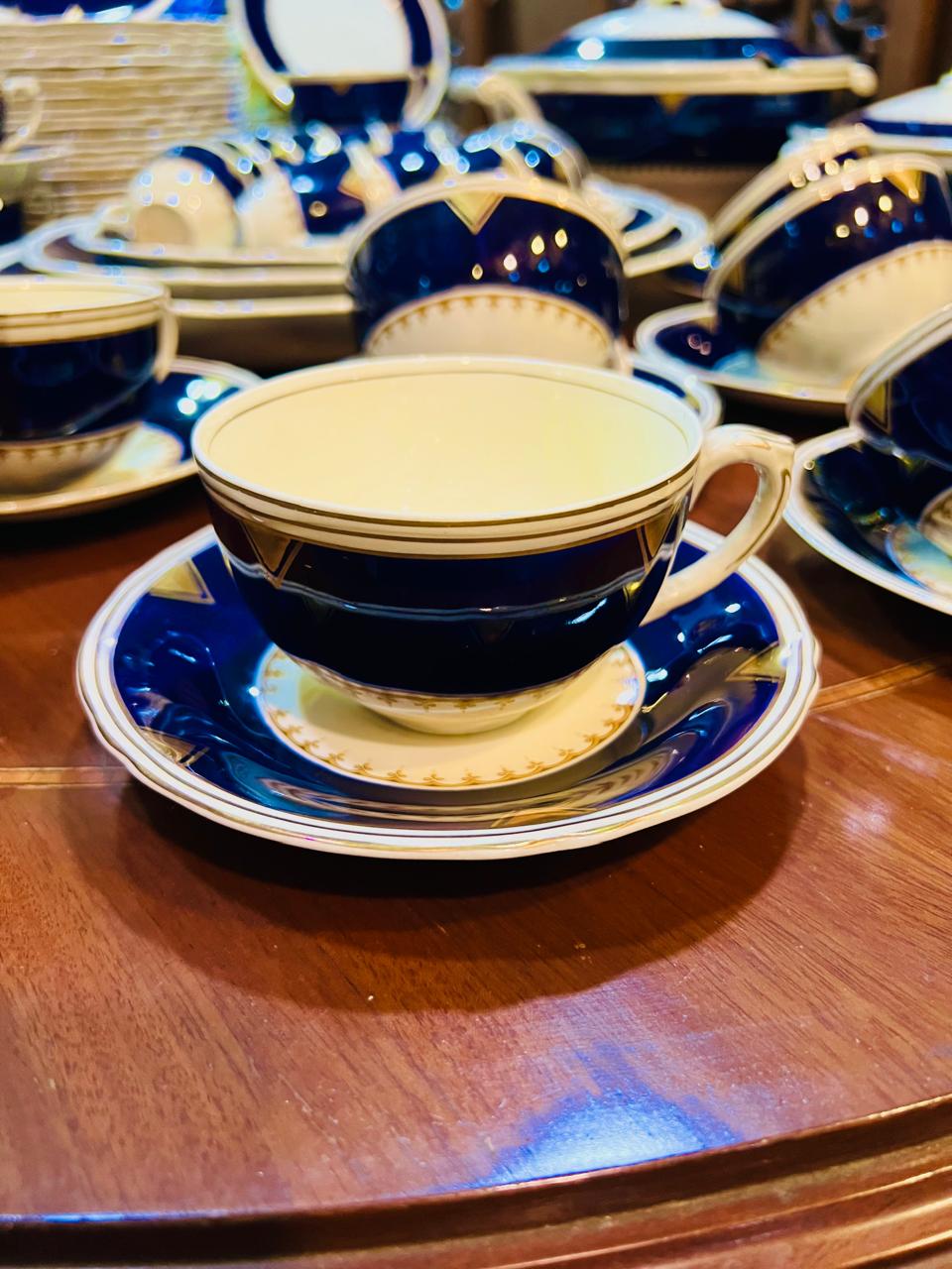 Inmejorable juego de vajilla de 107 piezas en loza inglesa de la empresa Albert Grindley modelo “Chandos” de base crema con bordes ondulados con líneas doradas, guarda azul cobalto con tringulos dorados y guirnalda interna en el mismo color, patrón perteneciente al estilo Art Deco de la década del 30. Consta de 24 platos playos, 12 platos hondos, 12 platos para postre, 12 tazas para té, 12 platos para taza de té, 12 tazas para café, 12 platos para café, 3 bandejas ovaladas de diferentes tamaños, bandeja redonda con asas, plato masitero con pie, 2 rabaneras, salsera, sopera y guisera. Todo se encuentra en excelente estado, sin marcas de uso.