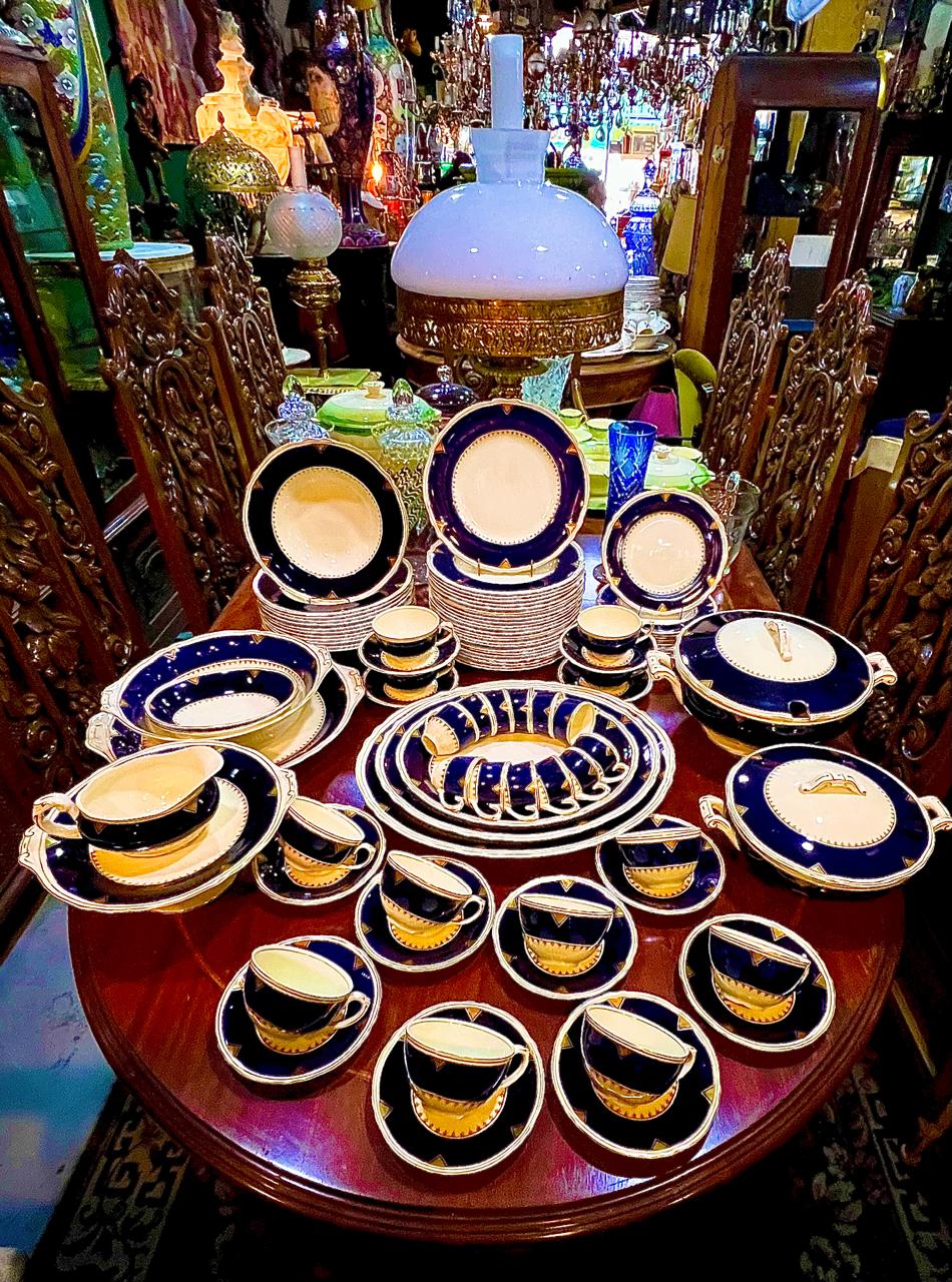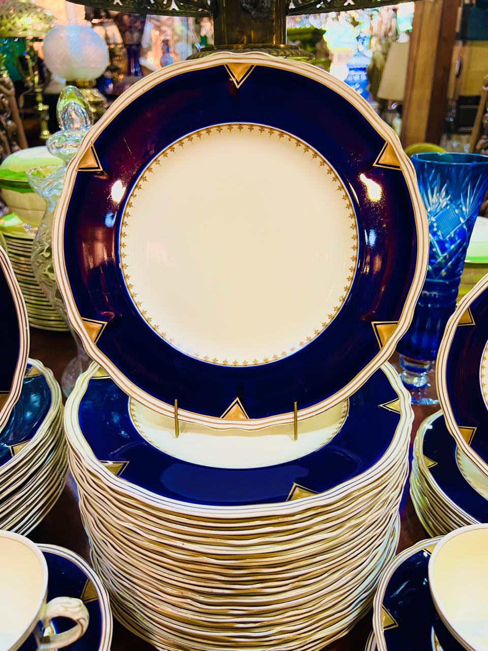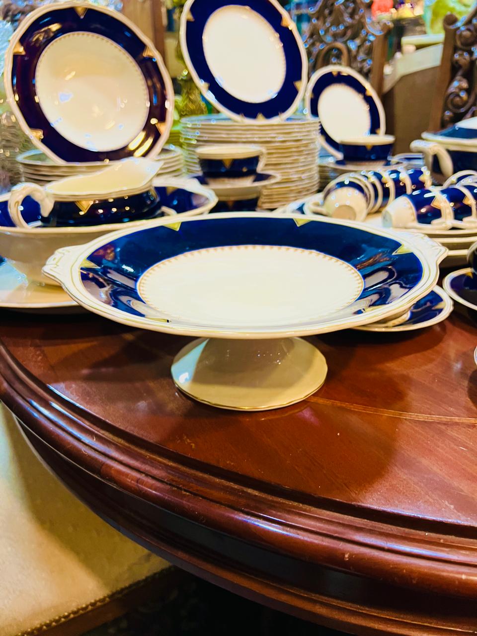 Inmejorable juego de vajilla de 107 piezas en loza inglesa de la empresa Albert Grindley modelo “Chandos” de base crema con bordes ondulados con líneas doradas, guarda azul cobalto con tringulos dorados y guirnalda interna en el mismo color, patrón perteneciente al estilo Art Deco de la década del 30. Consta de 24 platos playos, 12 platos hondos, 12 platos para postre, 12 tazas para té, 12 platos para taza de té, 12 tazas para café, 12 platos para café, 3 bandejas ovaladas de diferentes tamaños, bandeja redonda con asas, plato masitero con pie, 2 rabaneras, salsera, sopera y guisera. Todo se encuentra en excelente estado, sin marcas de uso.