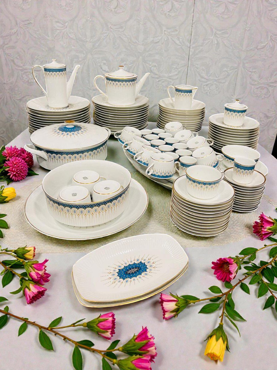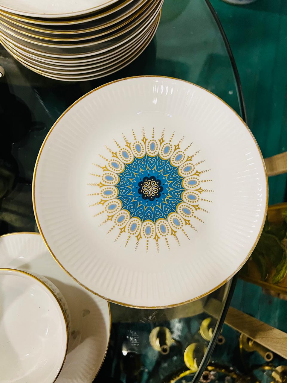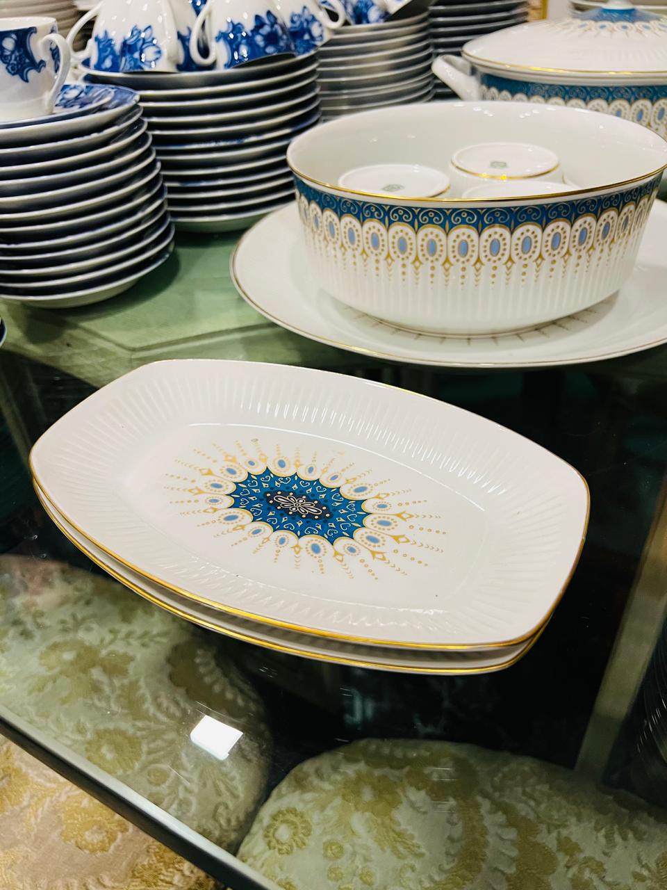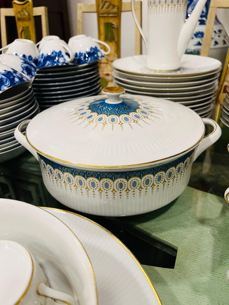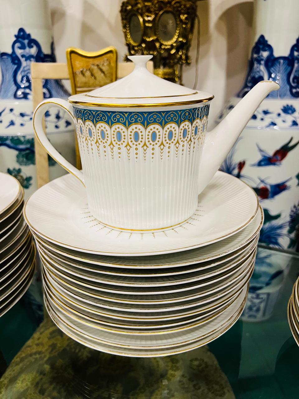 Juego de porcelana en base blanca con un singular diseño en tono turquesa y guardas doradas que lo realzan. 24 platos playos, 12 platos hondos, 11 platos para postre, 12 tazas de té, 12 platos de té, 10 tazas de café, 12 platos de cafe, 2 rabaneras, platos de torta, ensaladera, salsera con presentoire, guisera, cafetera, tetera, lechera, azucarera y 2 fuentes ovaladas, un total de 105 piezas de excelente calidad.